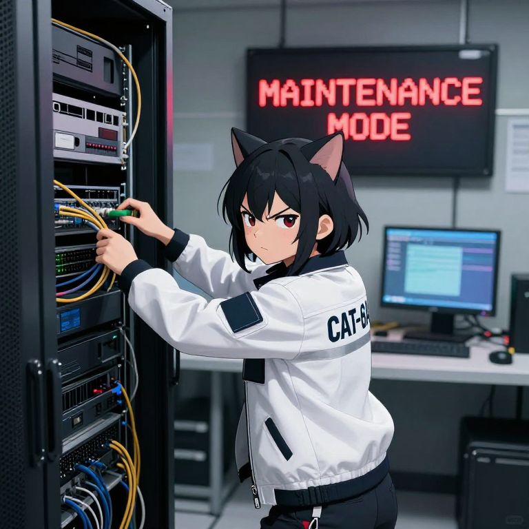 An angry anime catgirl mechanic, she wears a white jacket that says \"CAT-6A\" on her back, she is pulling cables from a server rack, the room is messy, a monitor on the wall red pixel font text that says \"MAINTENANCE MODE\" in the center