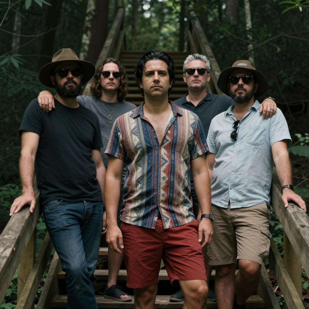 Photograph of five men standing on a wooden staircase in a forest. Central man with dark hair, open patterned shirt, red shorts, leans on railing. Other men wear various shirts, hats, and sunglasses, with arms around each other. Dark green foliage in background. Central man's intense expression contrasts with relaxed poses of others. Five men, forest setting, wooden staircase.