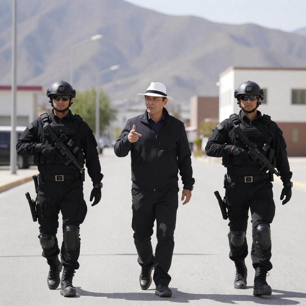Photograph of three men walking down a sunlit, deserted street. The central man, wearing a white hat and black jacket, gestures with his right hand. He is flanked by two armed men in tactical gear; one on the left and one on the right. Background includes a mountain, streetlights, and buildings.