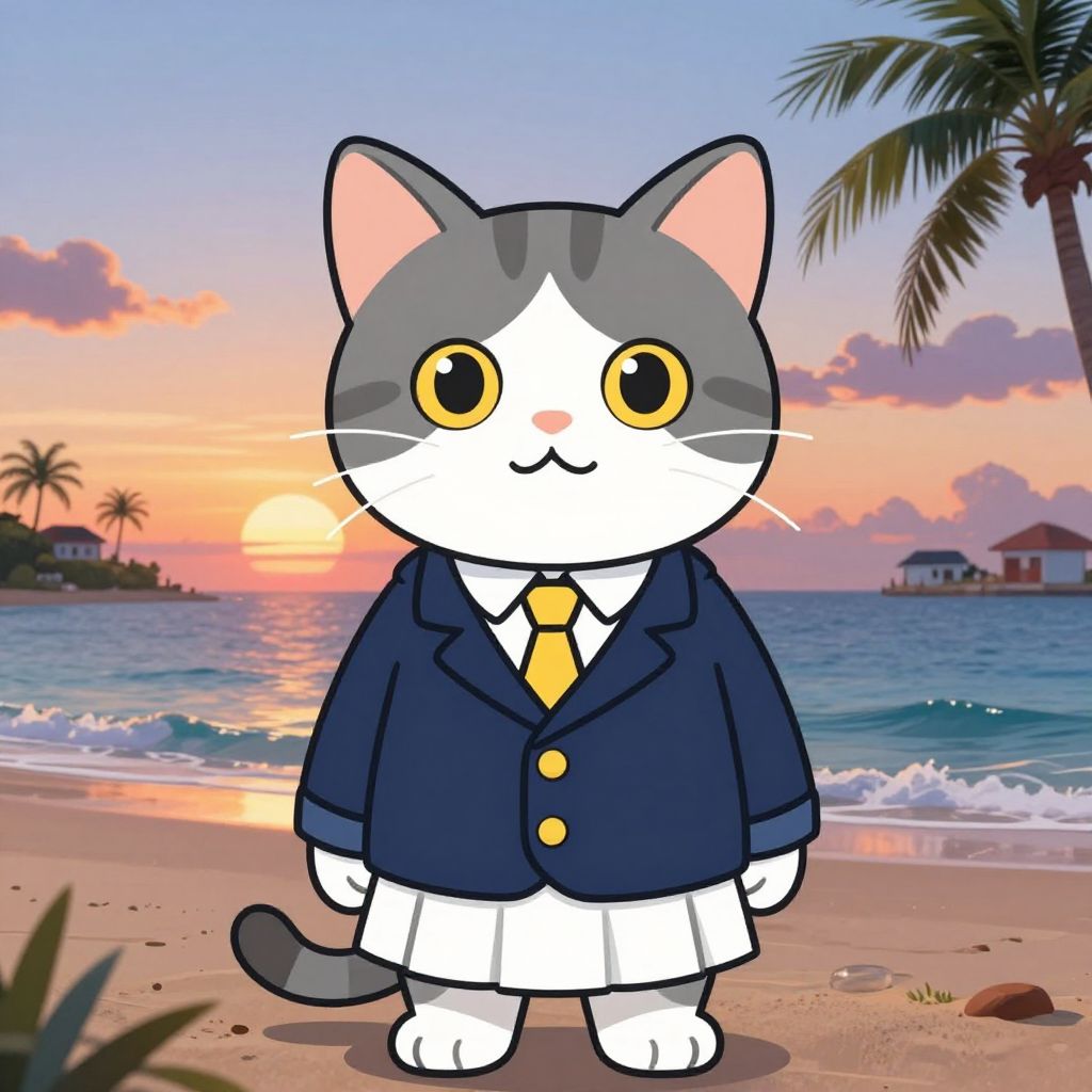 Digital drawing of a cute, anthropomorphic white and grey cat with large yellow eyes standing on a beach at sunset. The cat wears a navy blue school blazer with gold buttons, a white shirt, and a yellow tie, along with a white pleated skirt. The background features a colorful sunset with orange, pink, and purple clouds, a calm ocean, and palm trees on the left and right. A small house with a red roof is visible on the horizon. The sand is light brown, and the cat's expression is friendly and cheerful.