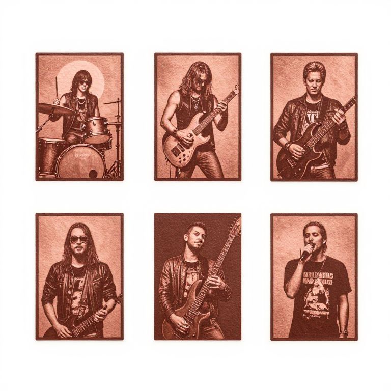 "Corporate Espionage klassic stamp set with 5 stamps, copper style, every one with Rock band musician: Drummer, Guitar Player, Bass Player, Keyboarder, Singer,"