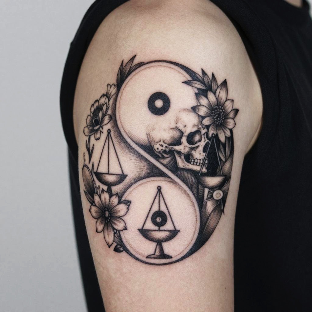 Surviving death tattoo, abstract representation of life and death balance through a yin-yang composed of skeletal and floral elements, delicate shading, detailed line art, placed on upper arm