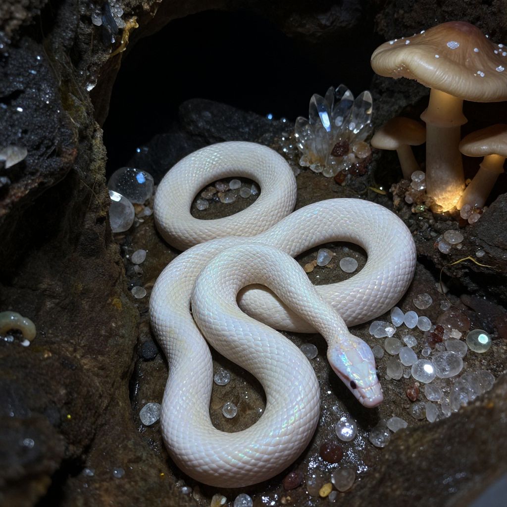 An iridescent white snake weaving through crystal formations in a dark cavern, light refracting off its pearlescent scales, amidst glowing mushrooms and sparkling mineral gems, blending fantasy and natural elegance in a surreal environment.
