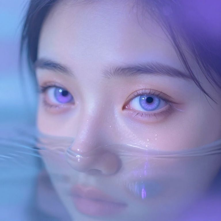 Surreal portrait highlighting indigo eye color, eyes radiating a soft purple glow, face partially submerged in water with light ripples, reflections playing on the skin, dreamlike atmosphere, soft pastel background blending blue and violet tones