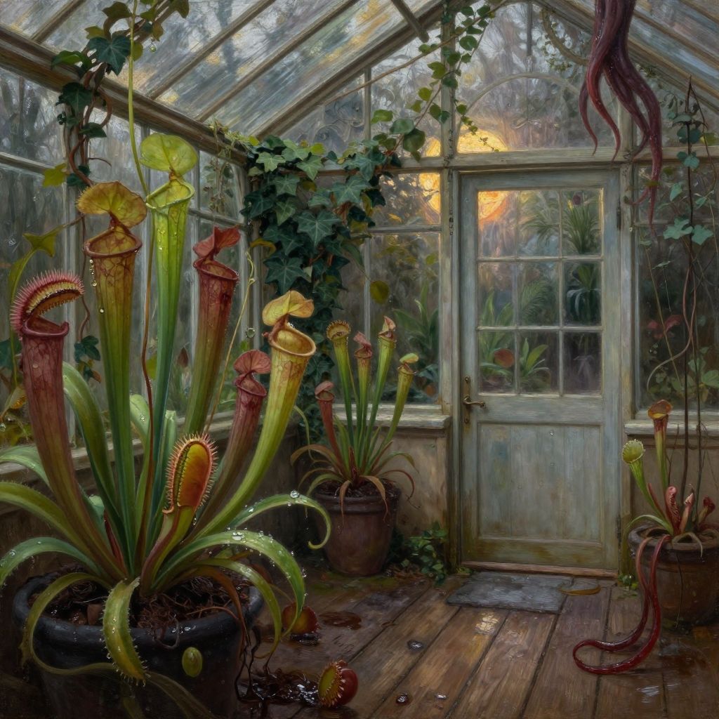 Score_9, score_8_up, score_7_up, score_6_up, score_5_up, DavyJonesLockerStyle Realistic oil painting of a Victorian greenhouse, dimly lit by the setting sun, showcasing a variety of carnivorous plants such as Venus flytraps, pitcher plants, and sundews, with vines and ivy creeping up the walls and iron structures, a few droplets of water on the leaves, weathered wooden floorboards, a stone pathway leading to a closed door, a sense of ancient whispers in the wind, cool color palette, muted greens, browns, and reds, soft shadows, and a high level of detail, horror (theme), wet, tentacles, (Masterpiece:1.3) (best quality:1.2) (high quality:1.1)