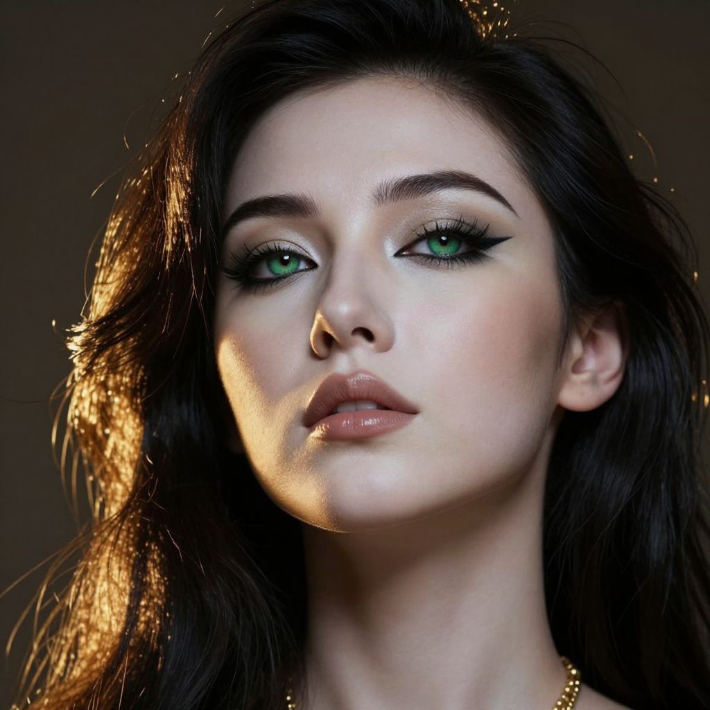 Create a high-resolution portrait of an enigmatic woman with porcelain skin and emerald eyes from an unconventional low angle. Employ Rembrandt's chiaroscuro technique blended with modern digital enhancements for photorealism. Golden light streaks illuminate her raven hair, highlighting facial contours and intricate eyeliner inspired by ancient Egyptian beauty standards. This timeless, sophisticated image exudes grace and mystery, drawing viewers into the captivating depths of her gaze.