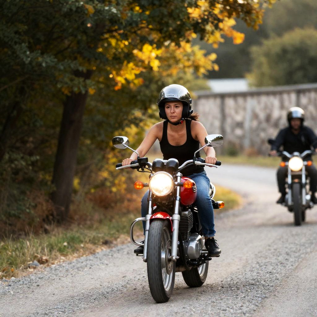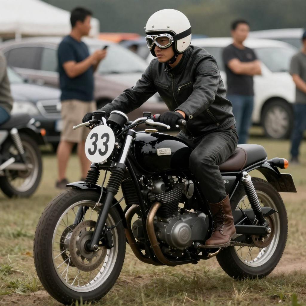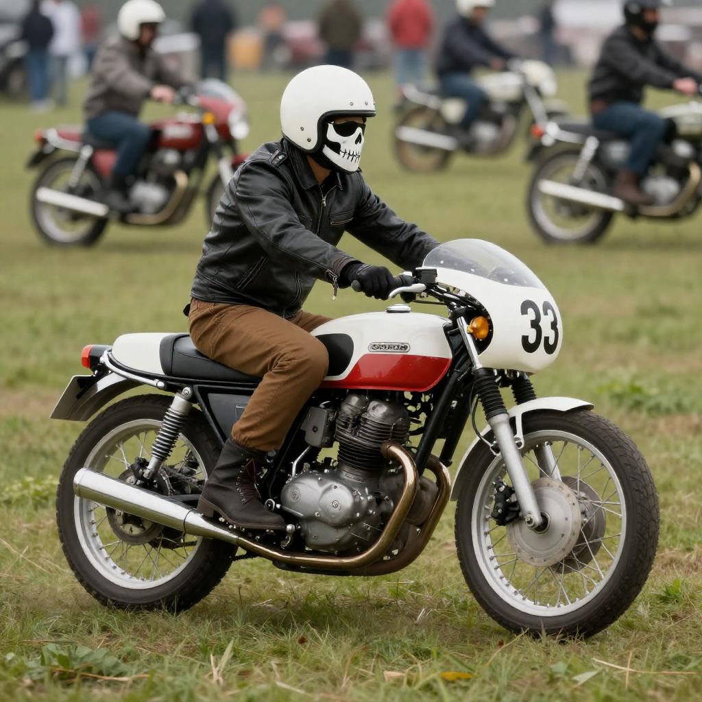 Photograph of a motorcyclist wearing a black leather jacket, brown pants, and a white helmet with a skull mask, riding a vintage motorcycle with the number 33 on the side. The motorcycle is on a grassy field, with other motorcycles and people in the background. The motorcyclist is leaning forward, gripping the handlebars. The motorcycle has a white and red tank. The scene is outdoors with a grassy field and blurred background.