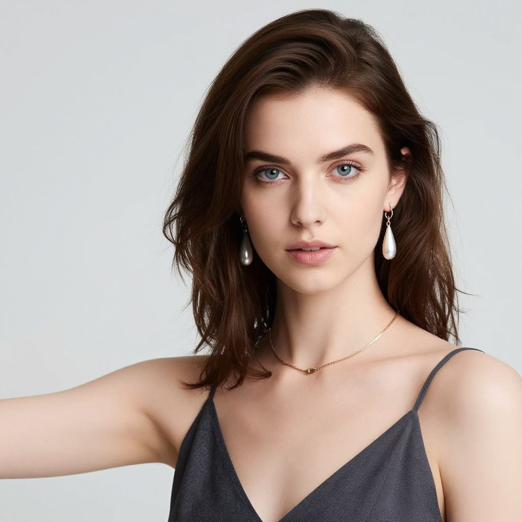 This photograph features a young white woman with fair skin and blue eyes, gazing directly at the camera with a neutral expression. She has shoulder-length, wavy brown hair and is wearing a sleeveless, dark gray, V-neck top. Her outfit is accessorized with simple, dangling white teardrop earrings and a delicate gold necklace with a small, circular pendant. She has light makeup, with subtle eyeliner and natural-colored lipstick. The background is a plain white, making her the focal point. The image has a clean, professional look with sharp details and even lighting.