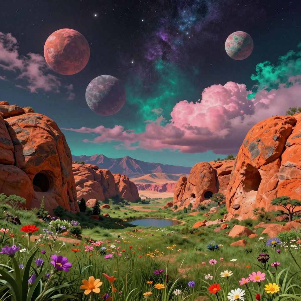 This vibrant digital painting depicts a fantastical landscape under a starry, cosmic night sky with three large, colorful planets. The foreground is lush with a variety of brightly colored wildflowers, including yellows, reds, purples, and whites, amidst green grass. Red and orange rocky formations dominate the mid-ground, with deep, shadowy caves. A serene blue river flows through the center, leading to distant purple and blue mountains. Pink and blue clouds float in the twilight sky, adding a dreamy atmosphere. The overall style is hyper-realistic with vivid colors and intricate details, creating a surreal, otherworldly scene.