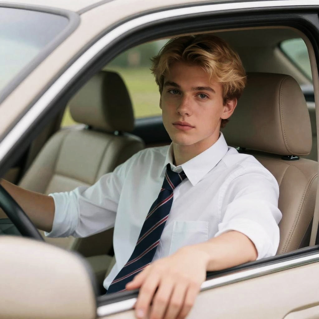 Photograph of a young man with light blonde hair, wearing a white dress shirt and striped tie, sitting in a beige car. He has a neutral expression, looking slightly to the side. His right hand rests on the car door. The car's interior features beige leather seats. The car window is partially open.