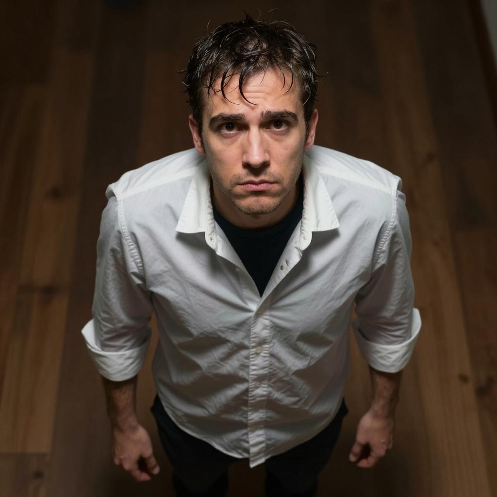 Photograph of a man with dark hair, wearing a dark suit, shouting with mouth open wide, blood splattered on his face and forehead. White background. His eyes are wide and intense. Upper body only visible.
