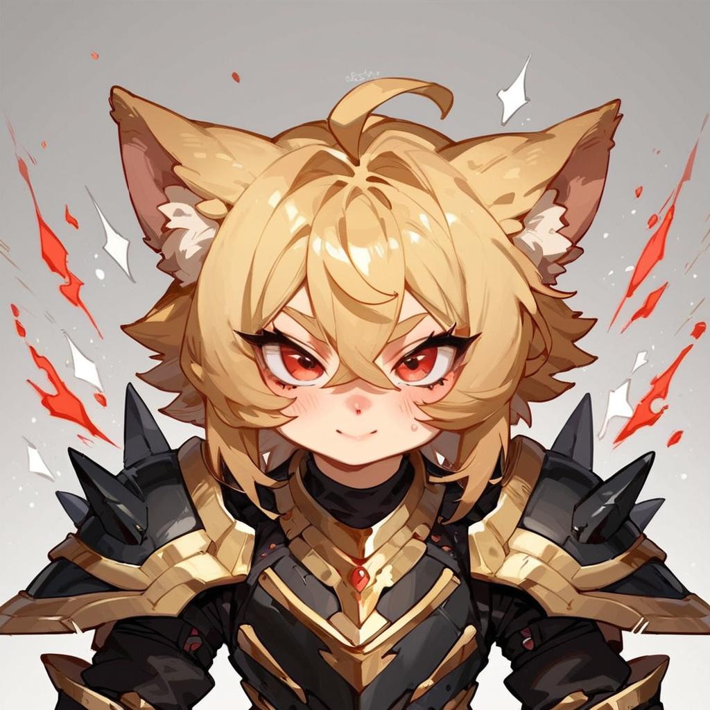 Score_9, score_8_up, score_7_up, score_6_up, necoarc, cat ears, blonde hair, red eyes, slit pupils, chibi, :3, edgAdepta, wearing edgAdepta, power armor, shoulder armor