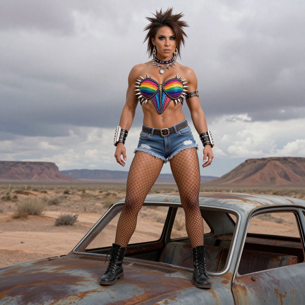 A fierce, muscular woman with tan skin and spiky brown hair stands confidently on a rusty car in a desert landscape. She's wearing a colorful, spiked, strapless top with rainbow patterns, denim shorts, fishnet stockings, and black lace-up boots. Her arms are adorned with metal and leather accessories. The cloudy sky and distant mesas add drama to the scene.