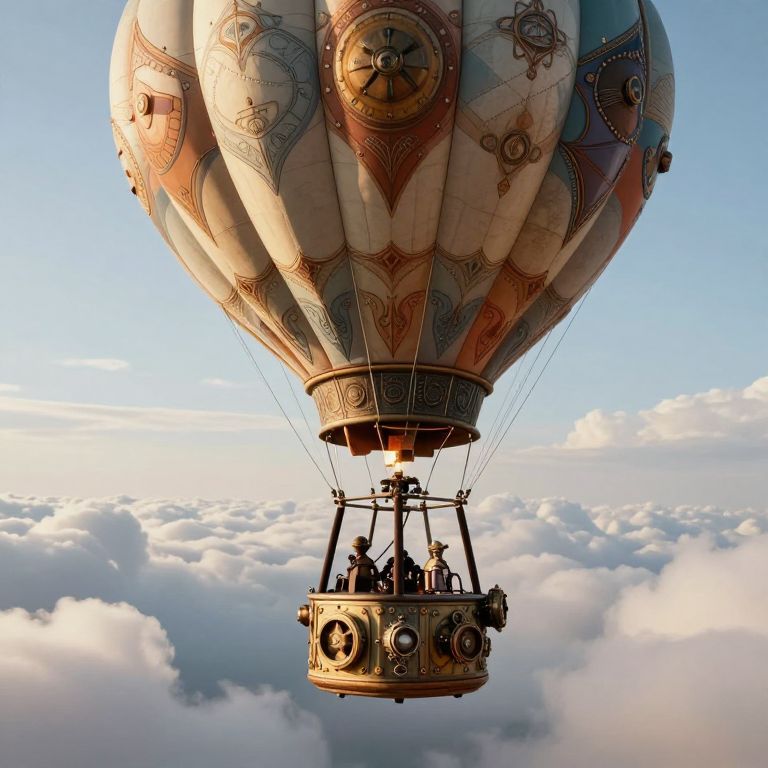 A fantastical hot air balloon with intricate designs and a steampunk-inspired gondola floating above a surreal, cloud-filled landscape.