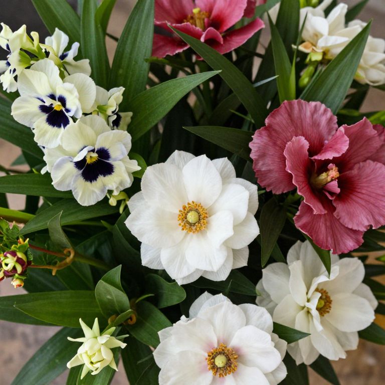 Close-up of a variety of blooming flowers surrounded by green leaves, emphasizing the details and colors in a natural, botanical arrangement.