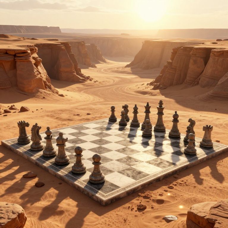 A surreal 3D-rendered scene depicts an ancient, colossal chessboard spanning a vast desert canyon, illuminated by the golden hour sun, where monolithic stone figures stand poised as living pieces, awaiting their next move during celestial eclipses, evoking a timeless, otherworldly atmosphere.