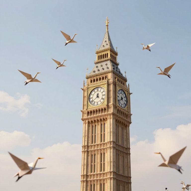 A surreal 3D-rendered scene depicts a whimsical flock of origami cranes gracefully lifting a towering clock tower into the ethereal sky, blending fantasy with architectural precision under soft, dreamlike lighting.