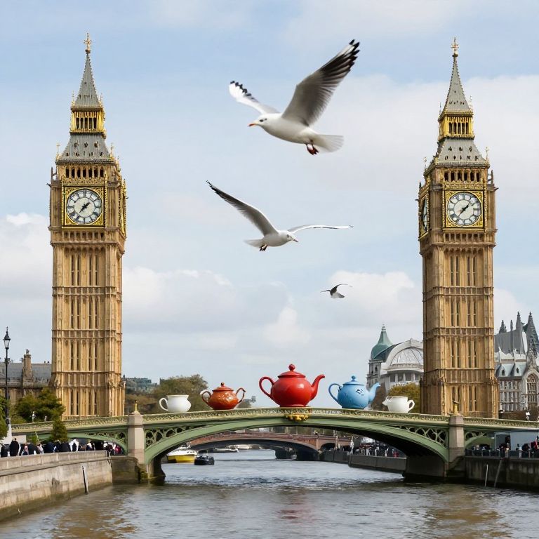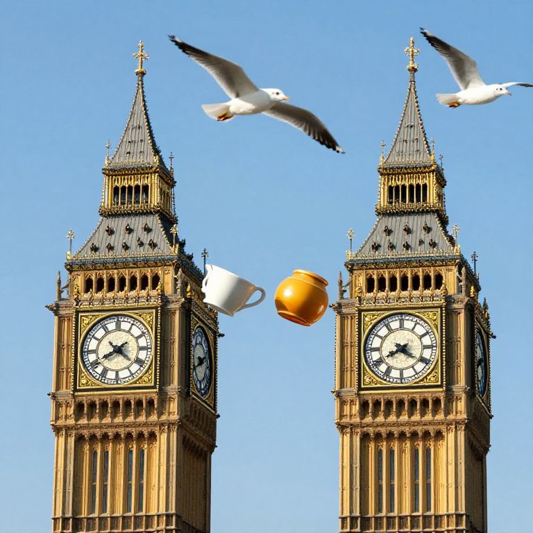Photograph of the iconic Elizabeth Tower, also known as Big Ben, against a clear blue sky with scattered white clouds. The tall, beige stone clock tower, adorned with a large, white clock face with black Roman numerals, stands prominently in the center. Seven white birds with outstretched wings are mid-flight around the tower, creating a dynamic sense of movement. The birds are in various positions, adding depth and a sense of freedom to the image. The sunlight casts a warm glow on the tower, enhancing its detailed stone texture.