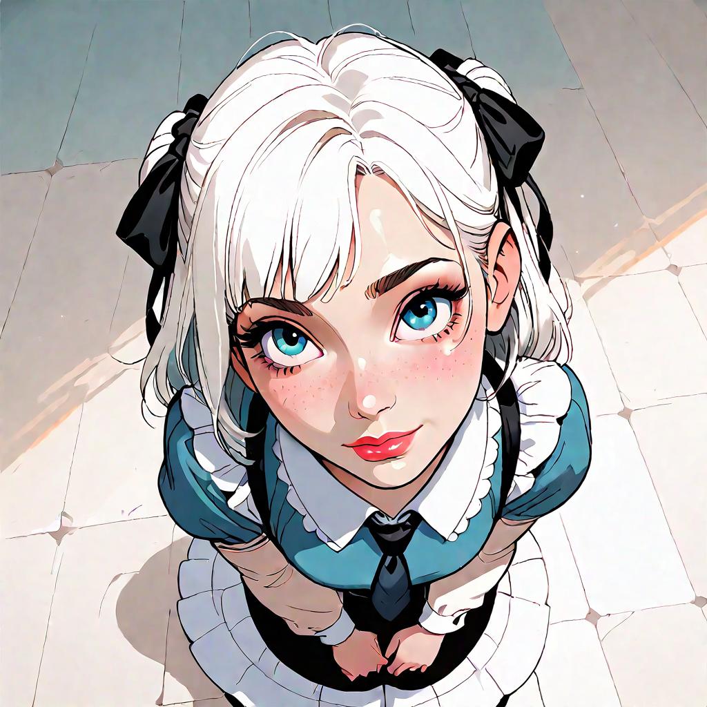 Score_9, score_8_up, score_7_up, score_6_up, score_5_up, score_4_up, vector, flat color, dress, hair ribbon, puffy sleeves, necktie, excited, from above, looking up