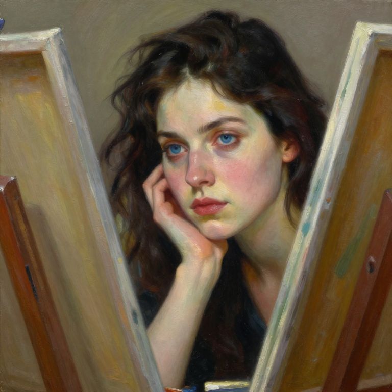 Emulate classical oil painting techniques to portray a female artist with serene yet intense blue eyes, her face a canvas of deep contemplation as she sketches life's vivid portrait. Capture this intimate scene from an unusual low-angle perspective, inviting viewers into the artist's viewfinder and fostering a connection between subject and creator. The warm hues of her vibrant studio contrast sharply against her pale skin and raven hair, creating a captivating interplay of light and shadow that accentuates every thoughtful line of her face. This detailed portrait should evoke both quiet introspection and profound artistic passion, drawing viewers into an emotional journey captured within the masterpiece's brushstrokes and colors.