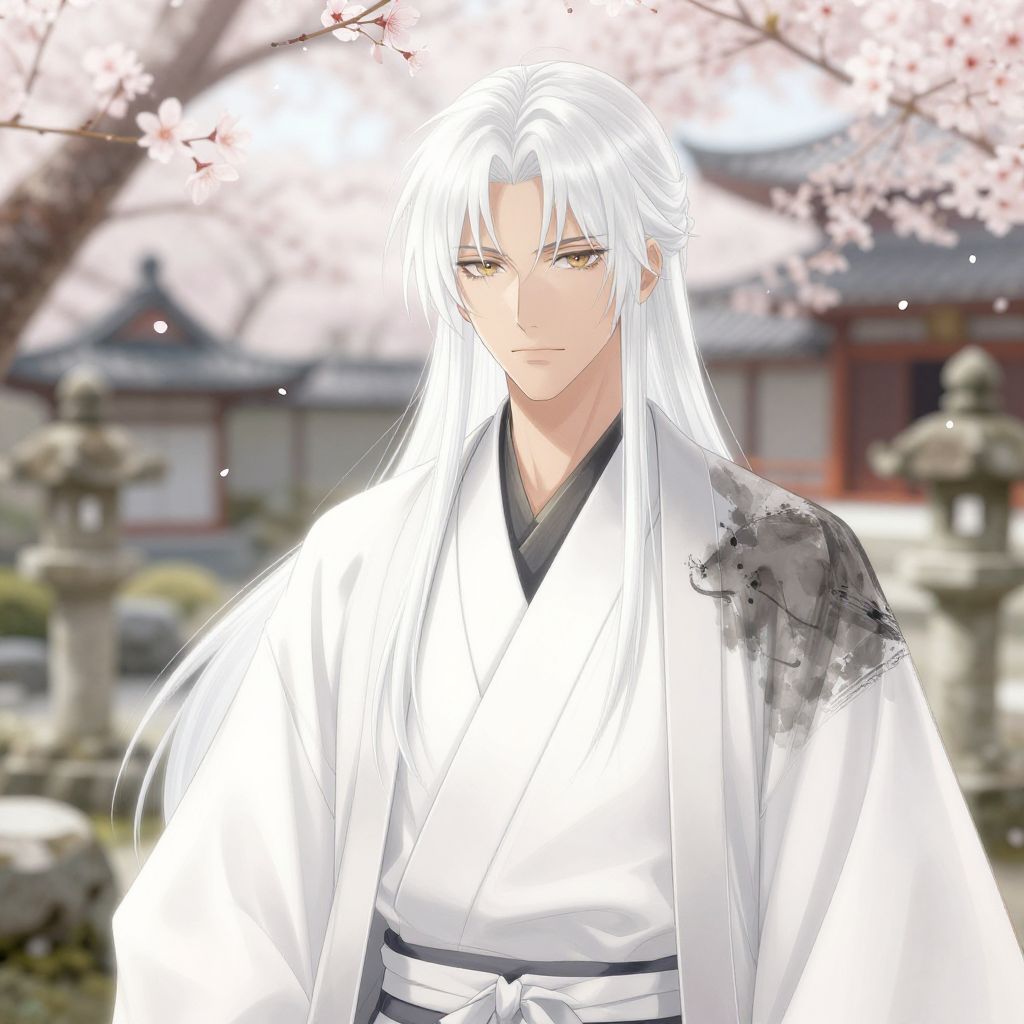 White hair male anime with sharp features, elegant traditional kimono, cherry blossoms swirling around, soft lighting illuminating his calm expression, delicate ink brush stroke style, tranquil garden background with ancient temples and stone lanterns.
