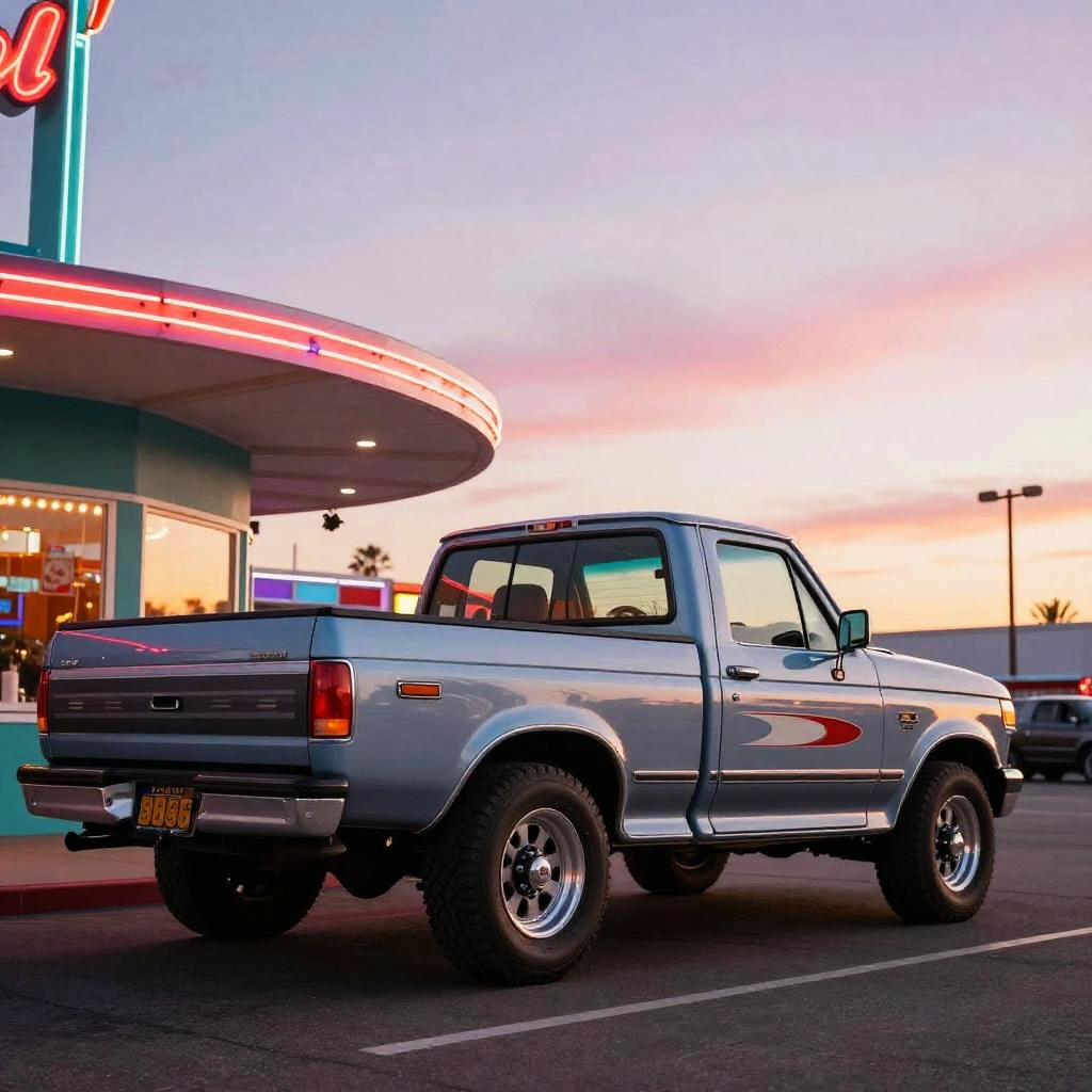 80s F150 pickup truck with retro decals and custom rims, parked at a drive-in diner, neon signs glowing, sunset pastel sky, nostalgic 80s vibe, cinematic composition