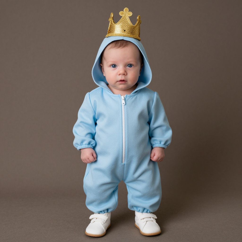 Newborn princess costume, solo, crown, 1boy, male focus, hood, looking at viewer, realistic, shoes, full body, standing, blue eyes