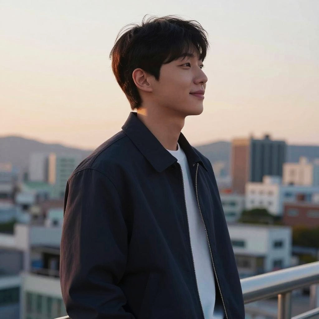 Korean profile picture featuring a handsome Korean man in casual streetwear, minimalist aesthetic, sharp details, gentle smile, blurred cityscape at sunset in background