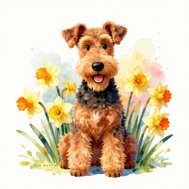 Vibrant Watercolor Airedale with Daffodils