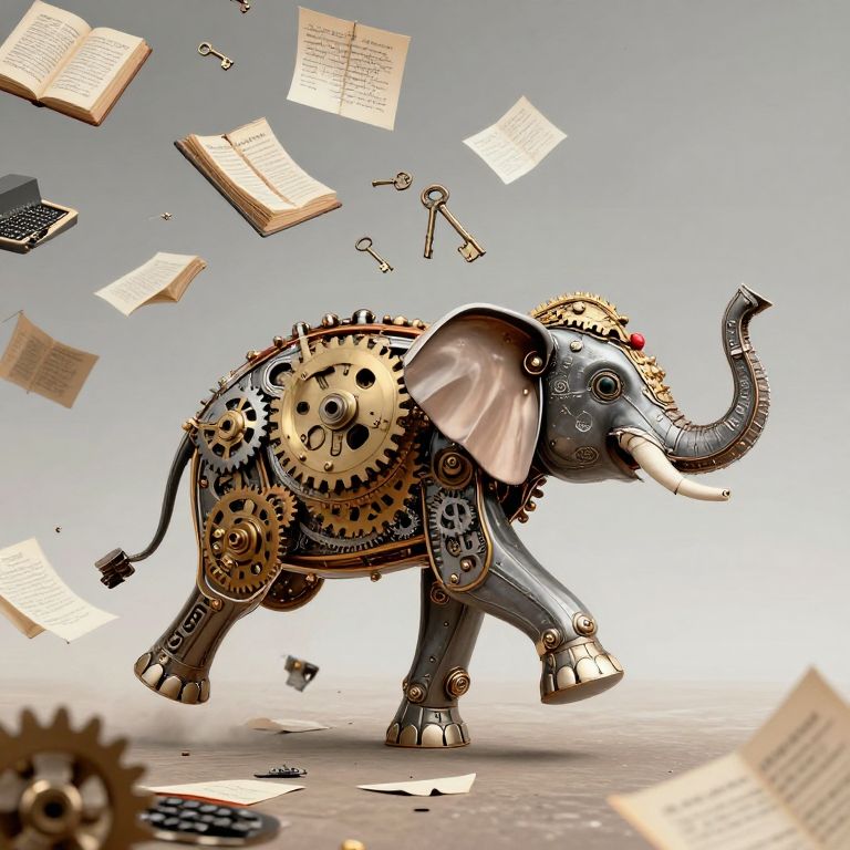 A clockwork elephant, made entirely of keys and gears, gallops through a sky filled with floating typewriters, crafting poetry with each step.