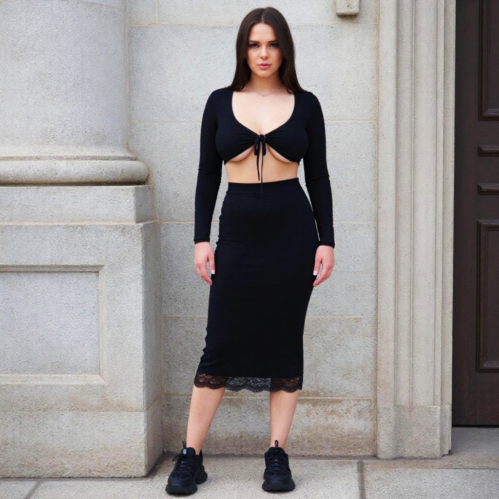 Photograph of a young woman with fair skin and long, straight dark brown hair standing against a stone building. She wears a black, long-sleeved crop top with a deep V-neck and tied front, revealing her midriff. She pairs it with a black, high-waisted, knee-length skirt featuring lace trim at the hem. She has black ankle boots with chunky soles. The background shows a textured stone wall and a dark wooden door to the right. Her expression is neutral, and she stands with her arms relaxed by her sides. The lighting is natural, highlighting the stone texture.