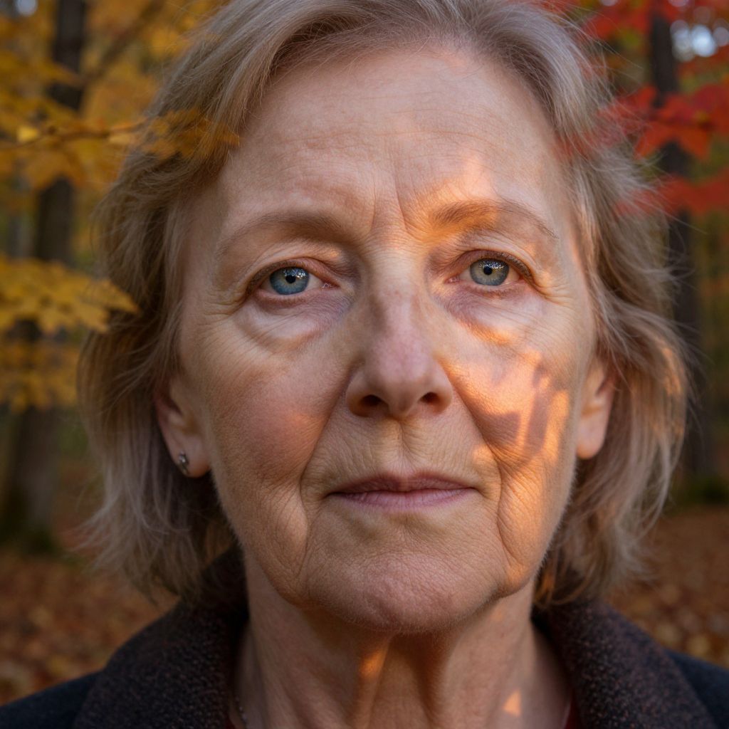 A striking double exposure portrait captures an older woman with deep-set wrinkles and piercing blue eyes. Her delicate features are softened by an ethereal sunset glow. The woman's face emerges from a serene autumn forest, a backdrop that merges vibrant gold and red hues, as if reflecting the cycle of nature in her aging skin. Light filters through the tree branches, casting dappled shadows on her cheeks, while her eyes reflect the stars above, blending the earthly with the celestial. Her gaze conveys both wisdom and a hint of melancholy, a testament to the journey of life intertwined with nature's fleeting beauty.