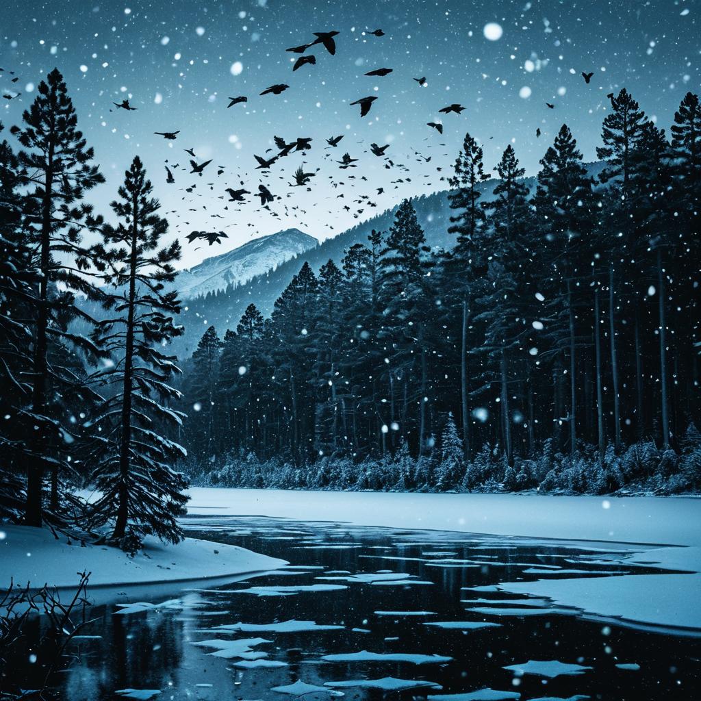 A wide-angle view of a tranquil winter scene featuring frosted pine trees surrounding a partially frozen lake under twilight. Snowflakes gently settle on the branches and the lake surface, while a flock of birds flies across the dusky sky. The landscape presents a surreal and hyper-realistic atmosphere with intricate details.