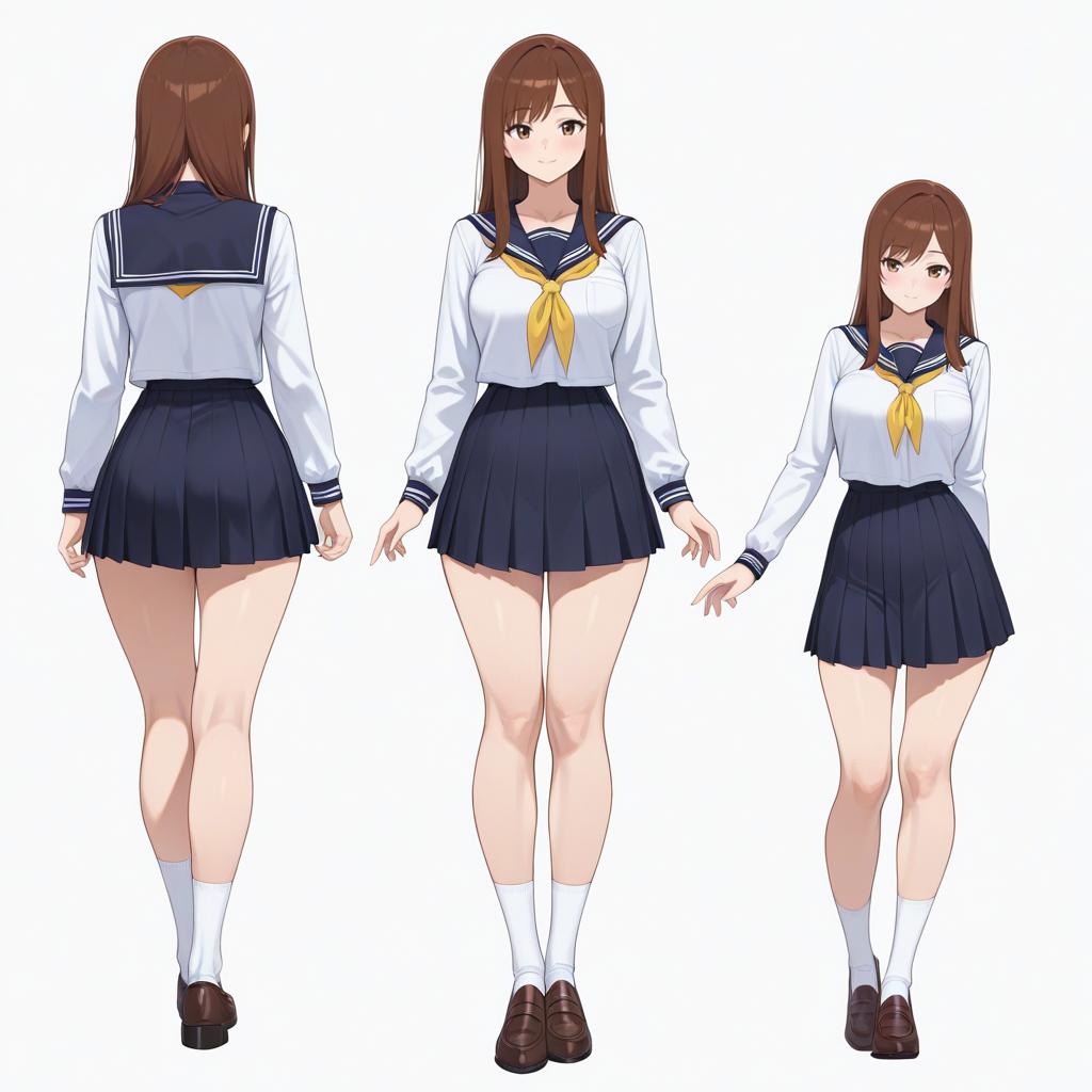 Charturnerv2, A character turnaround of a schoolgiri wearing school uniform. Multiple views of the same character in the same outfit, masterpiece, best quality, 1girl, ultra high res, full body, simple background, white background