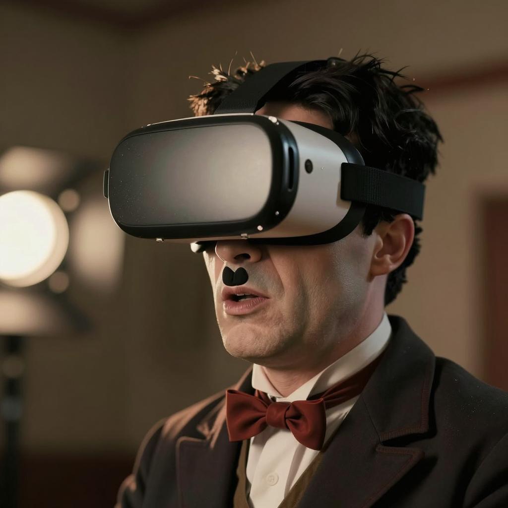 Layer Charly Chaplin with Virtual Reality Glasses hyper detailed, real face, HD, cinematography, photorealistic, Cinematic, Color Grading, Photography, Ultra-Wide Angle, Depth of Field, hyper-detailed, beautifully color-coded, insane details, intricate details, beautifully color graded, Cinematic, Color Grading, Editorial Photography, Photography, Photoshoot, Depth of Field, DOF, Tilt Blur, White Balance, 32k, Super-Resolution, Megapixel, ProPhoto RGB, VR, Halfrear Lighting, Backlight, Natural Lighting, Incandescent, Optical Fiber, Moody Lighting, Cinematic Lighting, Studio Lighting, Soft Lighting, Volumetric, Contre-Jour, Beautiful Lighting, Accent Lighting, Global Illumination, Screen Space Global Illumination, Ray Tracing Global Illumination, Optics, Scattering, Glowing, Shadows, Rough, Shimmering, Ray Tracing Reflections, Lumen Reflections, Screen Space Reflections, Diffraction Grading, Chromatic Aberration, GB Displacement, Scan Lines, Ray Traced, Ray Tracing Ambient Occlusion, Anti-Aliasing, FKAA, TXAA, RTX, SSAO, Shaders, OpenGL-Shaders, GLSL-Shaders, Post Processing, Post-Production, Cel Shading, Tone Mapping, CGI, VFX, SFX, insanely detailed and intricate, hypermaximalist, elegant, hyper realistic, super detailed, dynamic pose, photography, high quality,