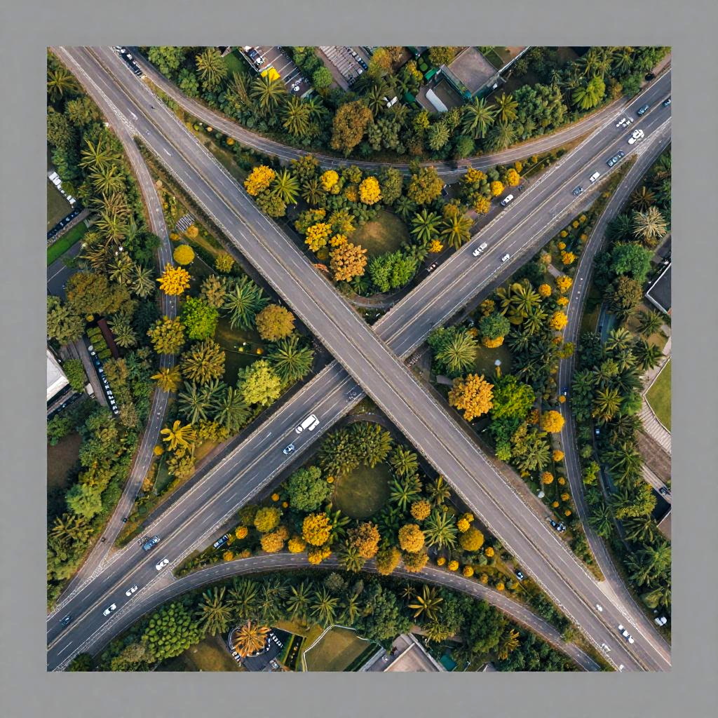 Aerial View of Complex Highway Interchange with Trees