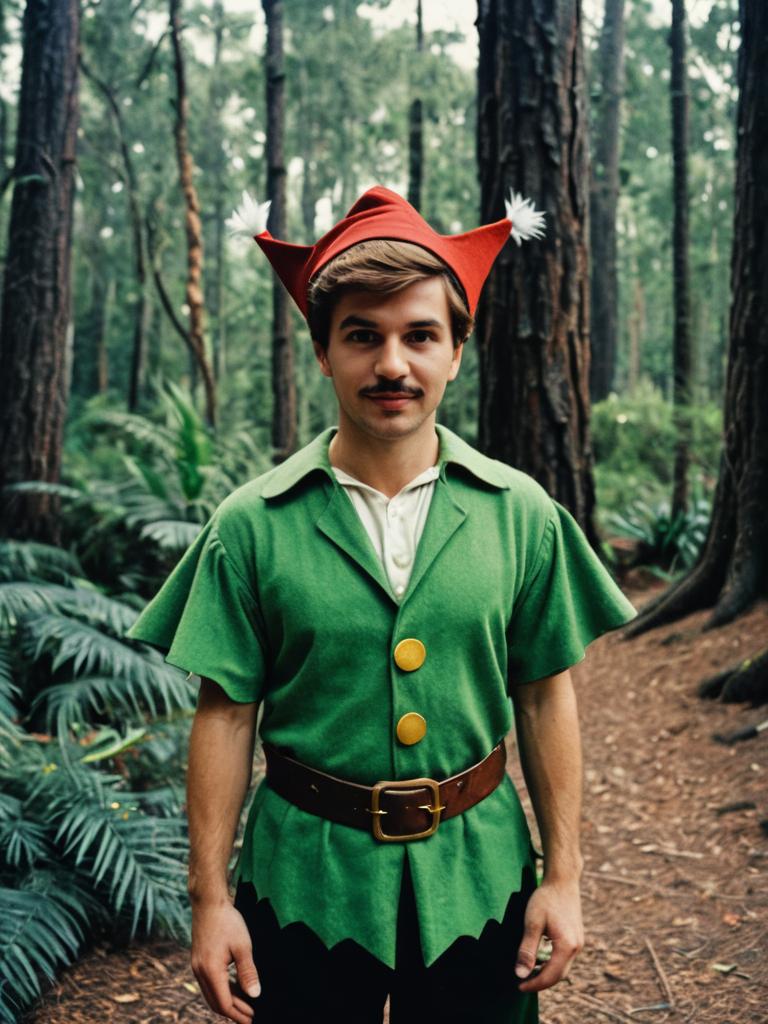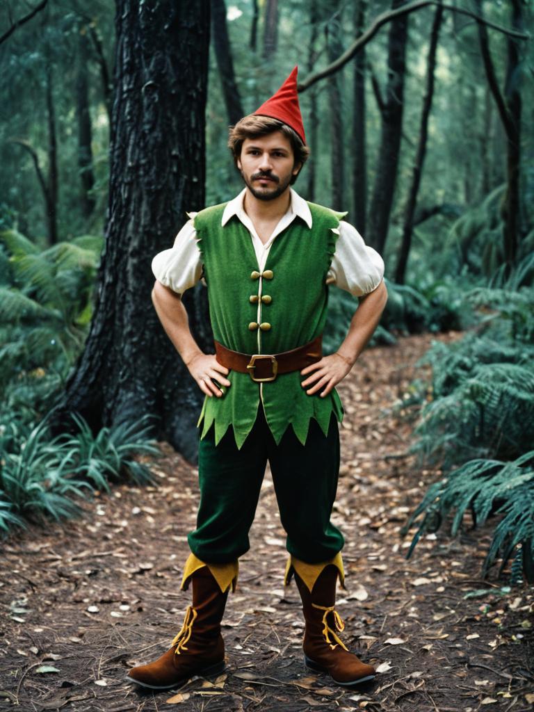 Man in Disney Peter Pan Costume, photorealistic outdoor portrait in forest setting