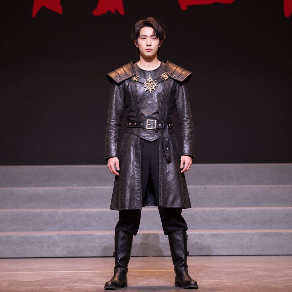 Photograph of an Asian male model on a runway, wearing a black leather long coat with gold shoulder epaulettes, black pants, and boots