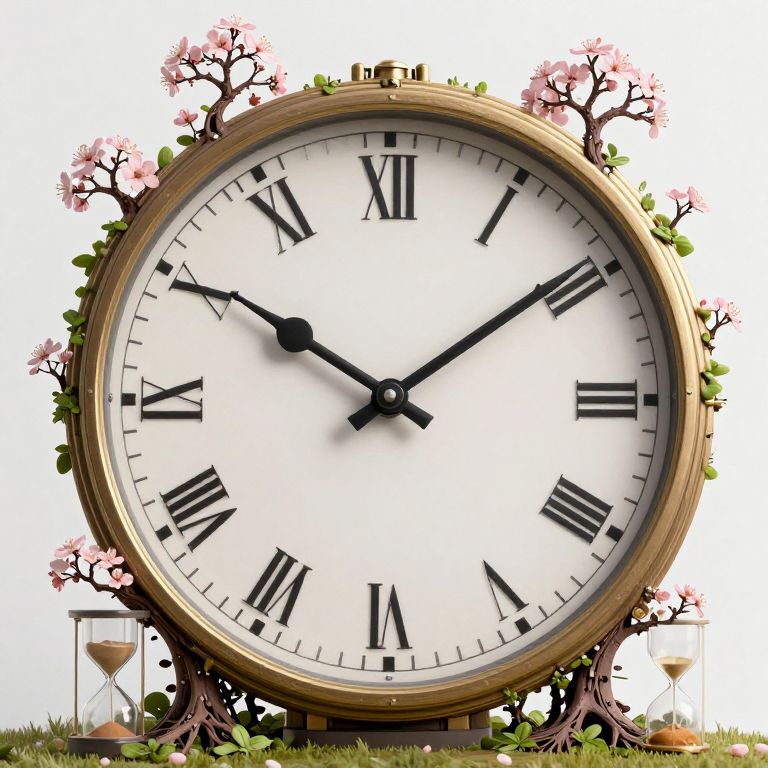 A clock’s hands have turned into mechanical trees, blossoming with hourglasses, where time is both planted and harvested.