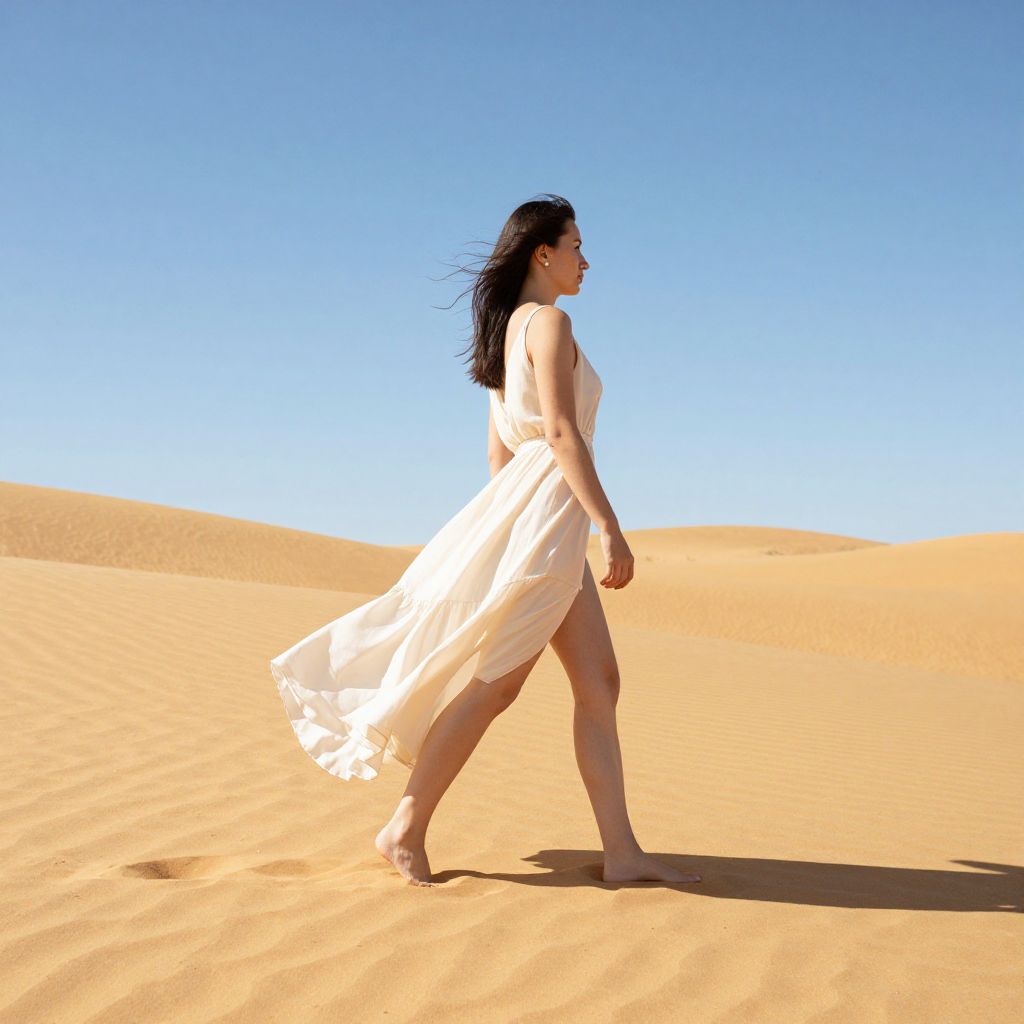 Photograph of a woman walking barefoot through a sunlit desert with golden sand dunes under a clear blue sky. She has long, dark hair blowing in the wind and wears a flowing, white, sleeveless dress that reaches mid-thigh. The dress billows slightly, and her skin tone is light brown. She is looking to the right, with a serene expression. The shadows on the sand indicate bright, direct sunlight. The background is simple, featuring only the expansive desert and clear sky, emphasizing the vastness and isolation of the landscape.