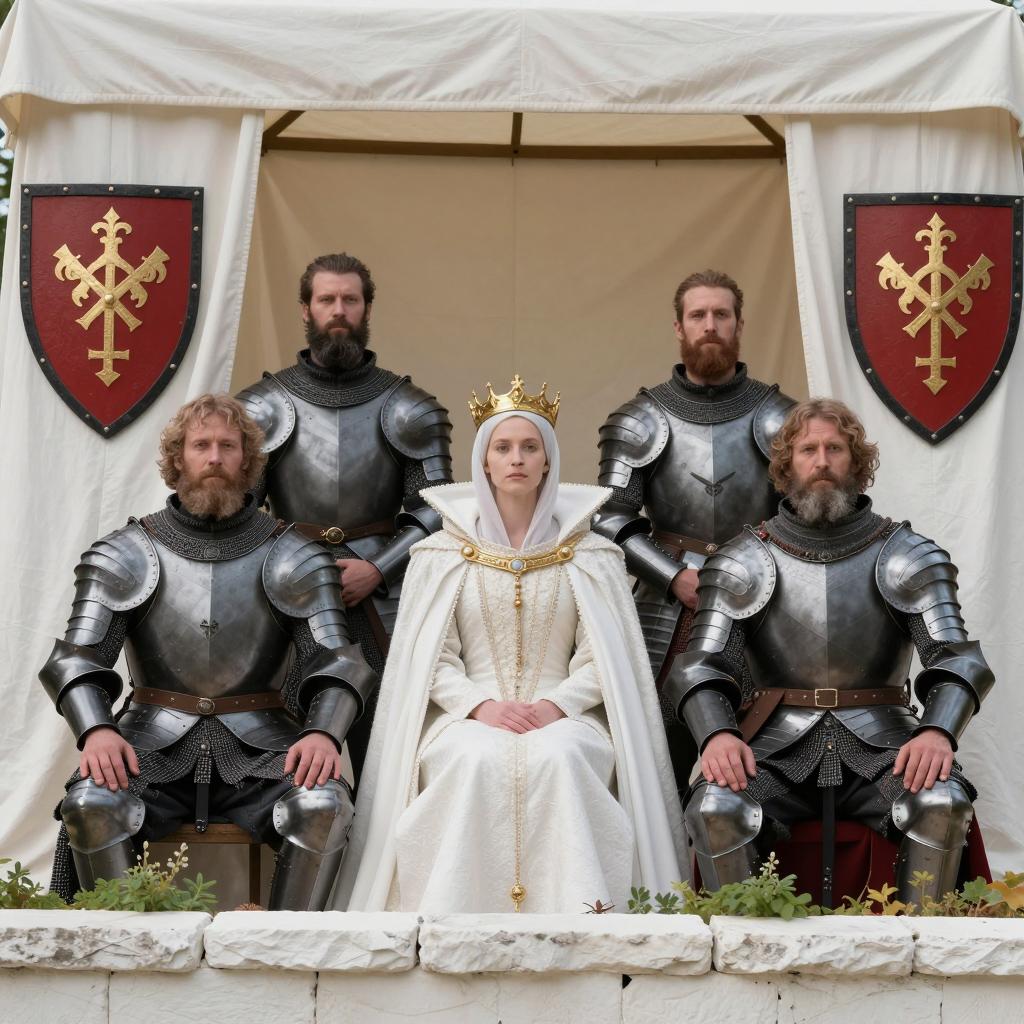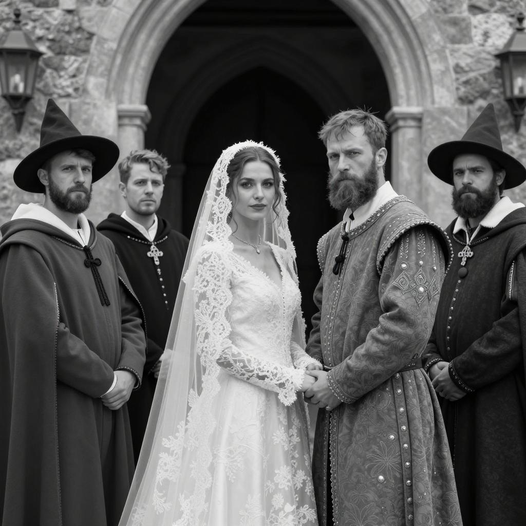 Black and white photograph of a medieval-style wedding. Bride in lace veil and gown, holding hands with bearded groom in ornate outfit. Group of men in hats and cloaks on either side. Stone archway in background. Bride center, groom right, men left and right. Groom's intense expression, others neutral. Stone ures, dark archway, sunlight.