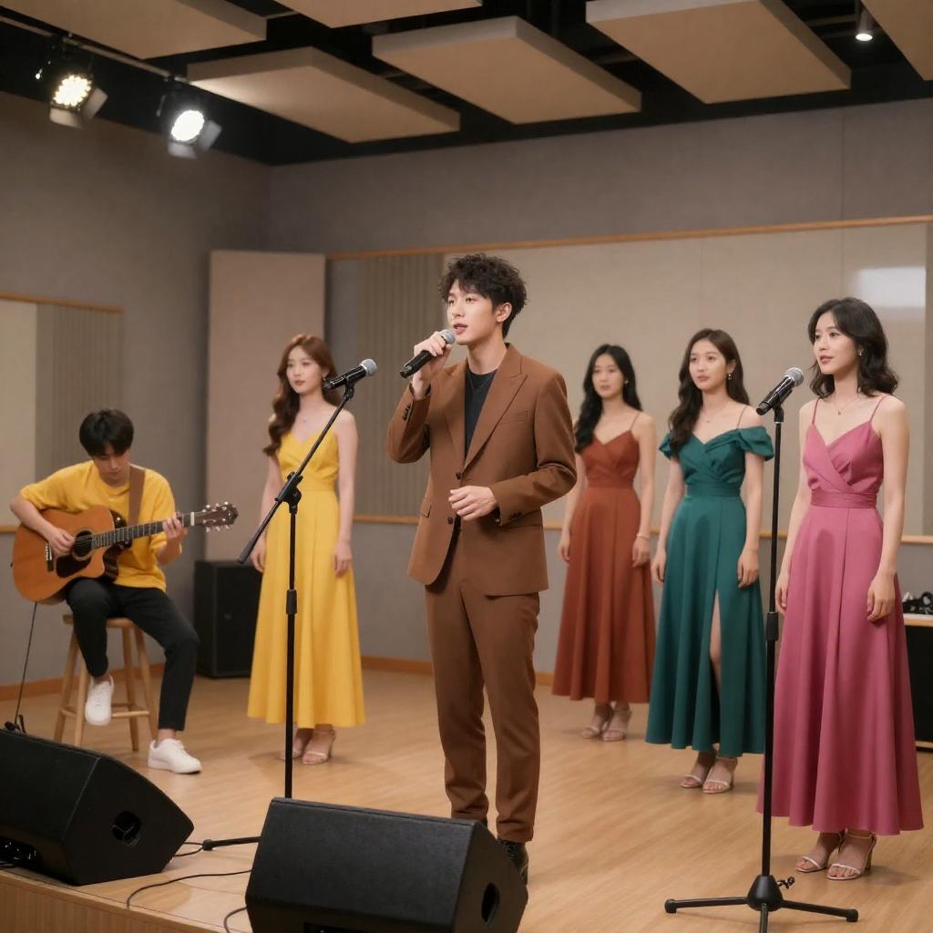 Photograph of a group performance. Male lead singer in black jacket and pants, holding microphone, center stage. Ten singers in white and yellow outfits, standing behind. Female singer in black dress, center front, holding microphone. Pink cherry blossom decor on both sides. Bright stage lights. Audience in foreground.