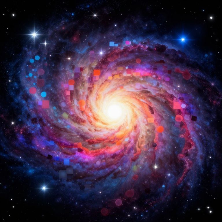 Neural art generator depicting a dreamlike cosmic scene filled with swirling galaxies made from vibrant pixels and abstract shapes, luminous stars blending with liquid colors, creating a mesmerizing fusion of digital art and celestial beauty.