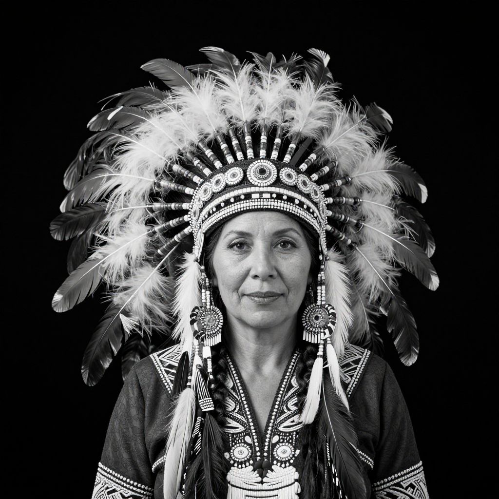 Black-and-white photo of a Native American woman wearing an elaborate headdress adorned with large feathers and intricate beadwork. Her expression is calm and composed, and she's dressed in a traditional garment with detailed patterns. The headdress is the focal point, with its radiant feathers and numerous beads, set against a solid black background that makes her features and attire stand out starkly.