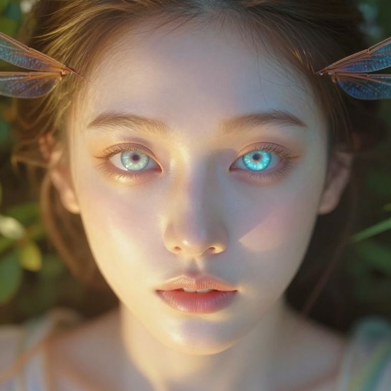 Ethereal portrait of a translucent-skinned being with luminescent features, viewed from an aerial perspective as if through dragonfly eyes. The subject's delicate face, crowned by mesmerizing eyes holding universes within, is bathed in soft golden light. This image captures otherworldly beauty and mystique amidst vibrant nature, evoking awe and curiosity.