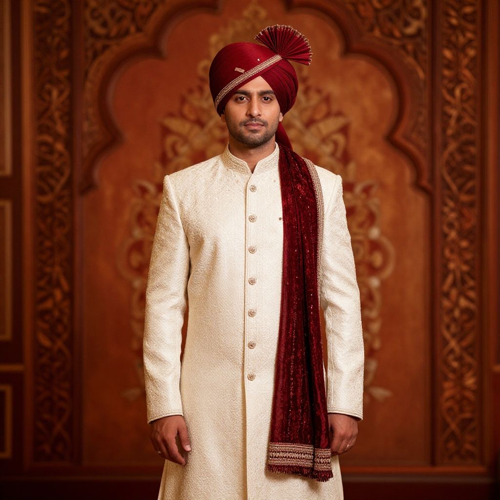 A man dressed in traditional Indian wedding attire stands against an ornate, richly patterned backdrop. He wears an ivory sherwani with intricate embroidery and a striking red turban complemented by a matching scarf, exuding elegance and cultural heritage.