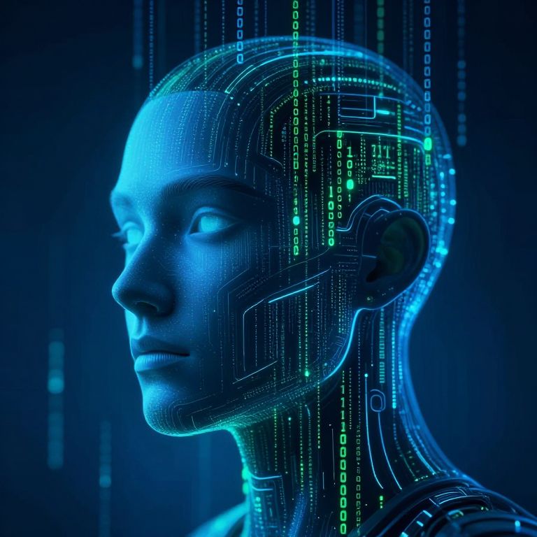 Profile picture.ai depicting a stylized AI face emerging from a matrix of binary code streams, deep blue and green tones, glowing elements highlighting facial features, cybernetic and tech-inspired artwork.