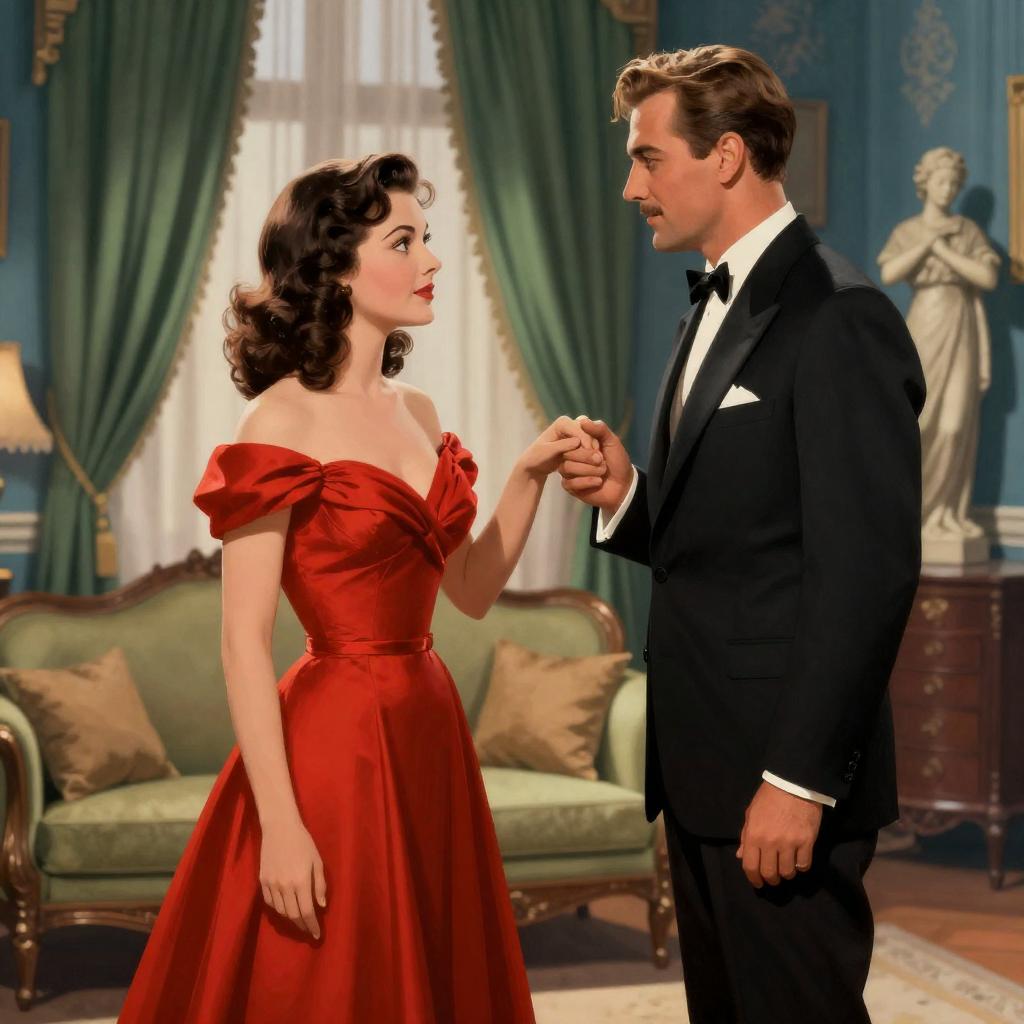 Vintage movie poster illustration. Man in black tuxedo and bow tie, with short dark hair, sits at table, looking at woman in green dress with curly red hair. Yellow table lamp, glassware on table. Background: crowd dancing, woman in red dress being spun by man in black tuxedo. Warm colors, 1940s style.