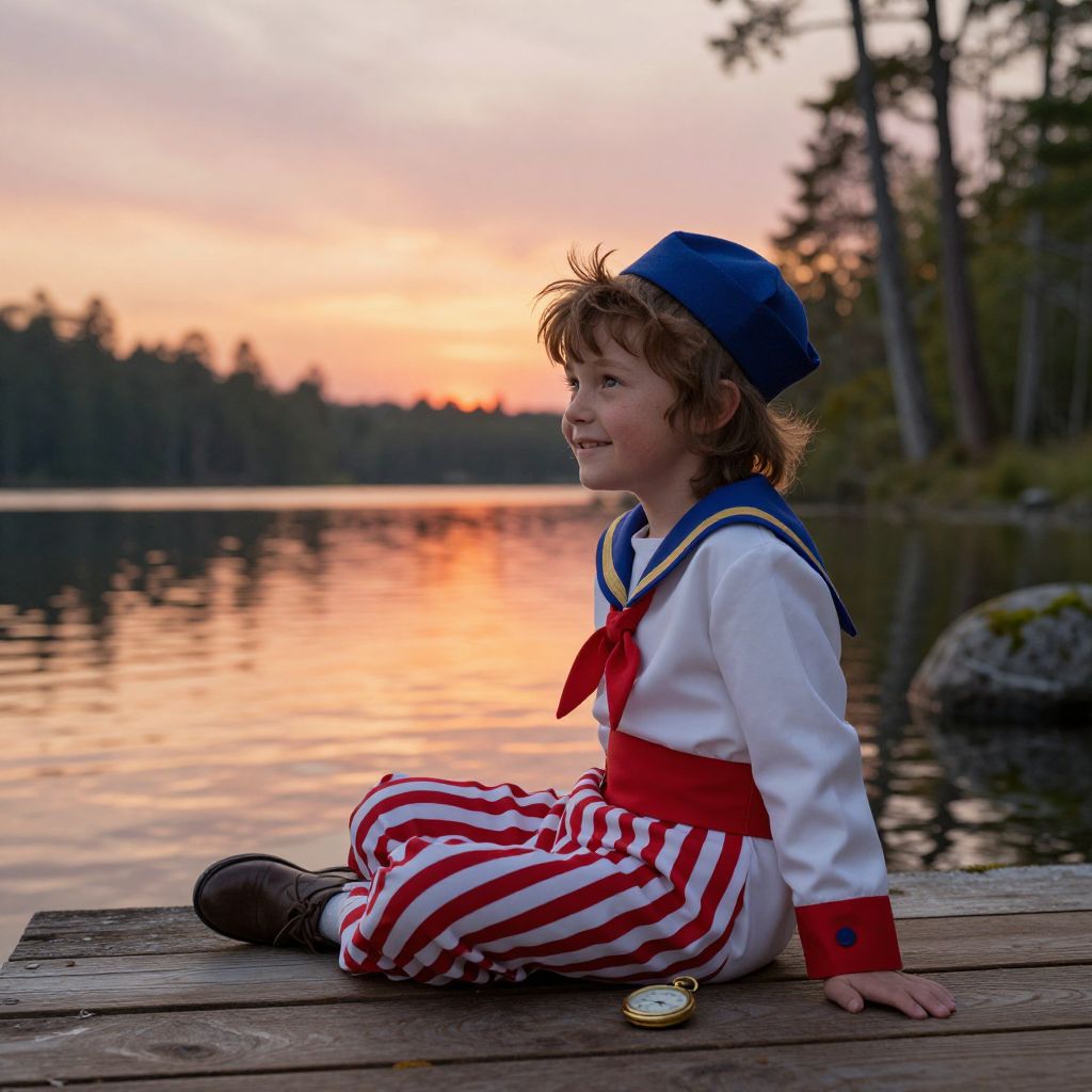 A child in a detailed Peter Pan costume sits on a wooden dock at sunset, the sky painted with soft oranges and pinks. The costume includes a white sailor-style jacket with a red sash, a red and white striped pants, a blue cap, and a small golden pocket watch. The child has messy brown hair, a freckled face, and a mischievous grin, looking out over a calm, shimmering lake surrounded by old trees and moss-covered rocks.