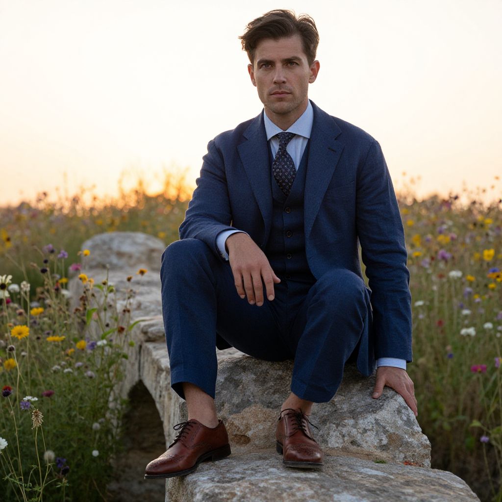 A man, navy blue linen three-piece suit, light blue cotton dress shirt, patterned silk tie, brown leather brogues, rustic stone arch bridge, vibrant wildflowers, serene sunset glow, soft focus, warm tones, contemplative expression. Man has masculine face and piercing eyes